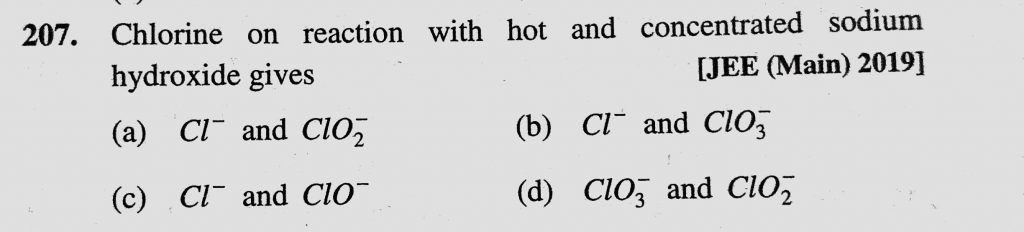 Chlorine on reaction with hot and concentrated sodium hydroxide gives (a) Cl- and ClO2- (b) Cl- and ClO3- Chlorine on reaction with hot and concentrated sodium hydroxide gives (a) Cl- and ClO2- (b) Cl- and ClO3- November 28, 2020 Category: Uncategorised (JEE Advanced Physics by BM Sharma + GMP Solutions) , Facebook Messenger WhatsApp Share this:TwitterFacebook Related