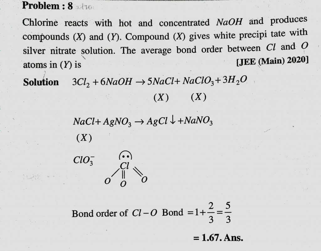 Chlorine reacts with hot and concentrated NaOH and produces compounds (X) and (Y) . Compound (X) gives white precipi take with silver nitrate solution. The average bond order between Chlorine reacts with hot and concentrated NaOH and produces compounds (X) and (Y) . Compound (X) gives white precipi take with silver nitrate solution. The average bond order between November 29, 2020 Category: Uncategorised (JEE Advanced Physics by BM Sharma + GMP Solutions) , Facebook Messenger WhatsApp Share this:TwitterFacebook Related