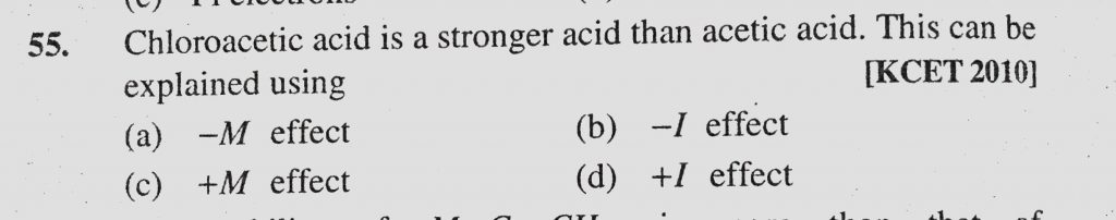 Chloroacetic acid is a stronger acid than acetic acid. This can be explained using (a) -M effect (b) -I effect Chloroacetic acid is a stronger acid than acetic acid. This can be explained using (a) -M effect (b) -I effect December 9, 2020 Category: Uncategorised (JEE Advanced Physics by BM Sharma + GMP Solutions) , Facebook Messenger WhatsApp Share this:TwitterFacebook Related