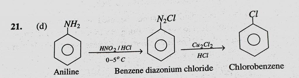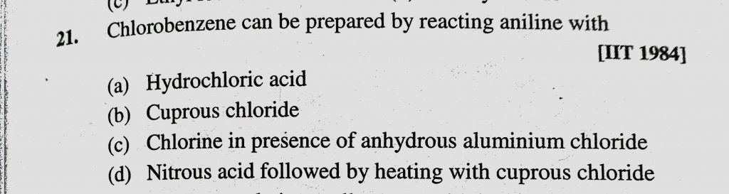 Chlorobenzene can be prepared by reacting aniline with (a) Hydrochloric acid (b) Cuprous chloride (c) Chlorine in presence of anhydrous aluminium chloride Chlorobenzene can be prepared by reacting aniline with (a) Hydrochloric acid (b) Cuprous chloride (c) Chlorine in presence of anhydrous aluminium chloride February 9, 2021 Category: Uncategorised (JEE Advanced Physics by BM Sharma + GMP Solutions) , Facebook Messenger WhatsApp Share this:TwitterFacebook Related
