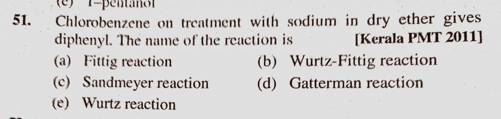 Chlorobenzene on treatment with sodium in dry ether gives diphenyl. The name of the reaction is (a) Fittig reaction (b) Wurtz-Fittig reaction (c) Sandmeyer reaction Chlorobenzene on treatment with sodium in dry ether gives diphenyl. The name of the reaction is (a) Fittig reaction (b) Wurtz-Fittig reaction (c) Sandmeyer reaction February 8, 2021 Category: Uncategorised (JEE Advanced Physics by BM Sharma + GMP Solutions) , Facebook Messenger WhatsApp Share this:TwitterFacebook Related