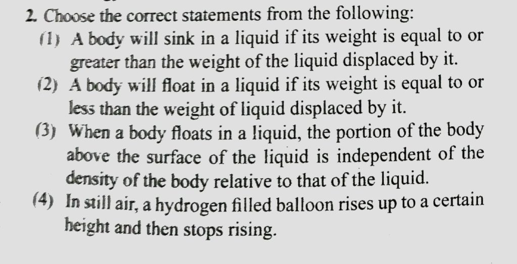 Choose the correct statements from the following: (1) A body will sink in a liquid if its weight is equal to or greater than the weight of the liquid displaced by it. Choose the correct statements from the following: (1) A body will sink in a liquid if its weight is equal to or greater than the weight of the liquid displaced by it. October 8, 2020 Category: Uncategorised (JEE Advanced Physics by BM Sharma + GMP Solutions) , Facebook Messenger WhatsApp Share this:TwitterFacebook Related