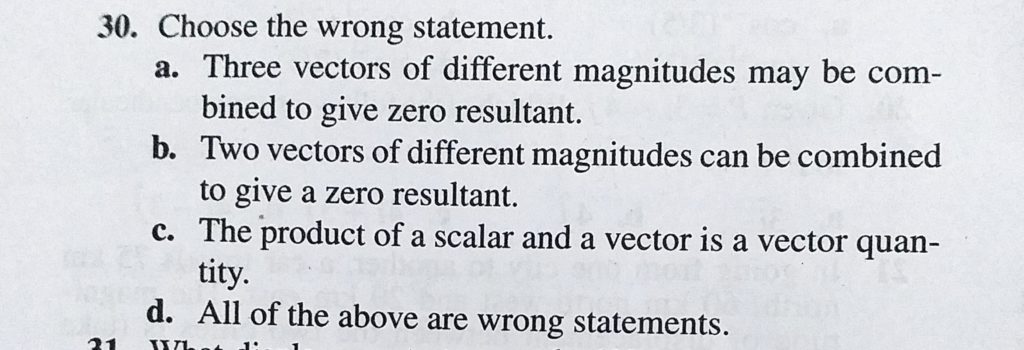 Choose the wrong statement a. Three vectors of different magnitudes may be combined to give zero resultant. b. Two vectors of different magnitudes can be combined to give a zero resultant. Choose the wrong statement a. Three vectors of different magnitudes may be combined to give zero resultant. b. Two vectors of different magnitudes can be combined to give a zero resultant. September 17, 2020 Category: Uncategorised (JEE Advanced Physics by BM Sharma + GMP Solutions) , Facebook Messenger WhatsApp Share this:TwitterFacebook Related