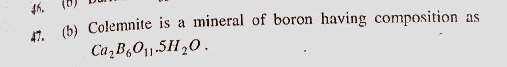 Colemnite is (a) Ca(B3O4(OH)2). 2H2O (b) Ca2B6O11.5H2) (c) Ca(OH)2 (d) Na2B4O7.2H2O Colemnite is (a) Ca(B3O4(OH)2). 2H2O (b) Ca2B6O11.5H2) (c) Ca(OH)2 (d) Na2B4O7.2H2O November 15, 2020 Category: Uncategorised (JEE Advanced Physics by BM Sharma + GMP Solutions) , Facebook Messenger WhatsApp Share this:TwitterFacebook Related