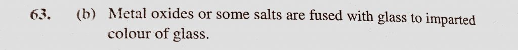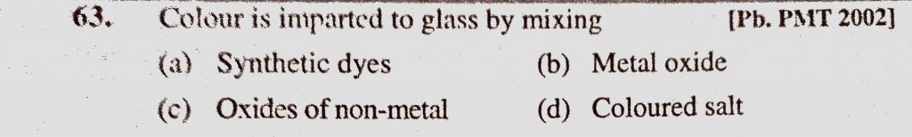 Colour is imparted to glass by mixing (a) Synthetic dyes (b) Metal oxide (c) Oxides of non-metal (d) Coloured salt Colour is imparted to glass by mixing (a) Synthetic dyes (b) Metal oxide (c) Oxides of non-metal (d) Coloured salt November 18, 2020 Category: Uncategorised (JEE Advanced Physics by BM Sharma + GMP Solutions) , Facebook Messenger WhatsApp Share this:TwitterFacebook Related