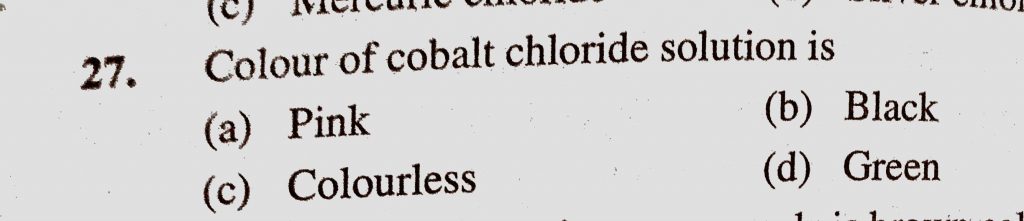 Colour of cobalt chloride solution is (a) Pink (b) Black (c) Colourless (d) Green Colour of cobalt chloride solution is (a) Pink (b) Black (c) Colourless (d) Green December 6, 2020 Category: Uncategorised (JEE Advanced Physics by BM Sharma + GMP Solutions) , Facebook Messenger WhatsApp Share this:TwitterFacebook Related
