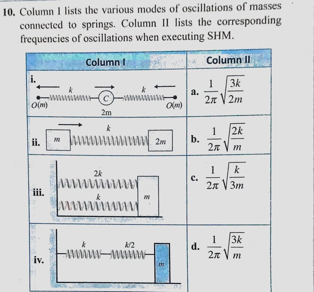 Column 1 lists the various modes of oscillations of masses connected to springs. Column 2 lists the corresponding frequencies of oscillations when executing SHM. Column 1 lists the various modes of oscillations of masses connected to springs. Column 2 lists the corresponding frequencies of oscillations when executing SHM. October 31, 2020 Category: Uncategorised (JEE Advanced Physics by BM Sharma + GMP Solutions) , Facebook Messenger WhatsApp Share this:TwitterFacebook Related