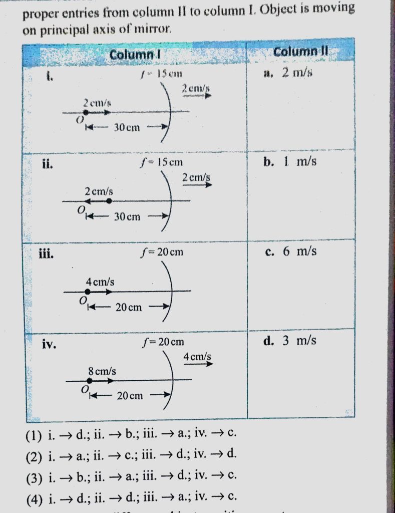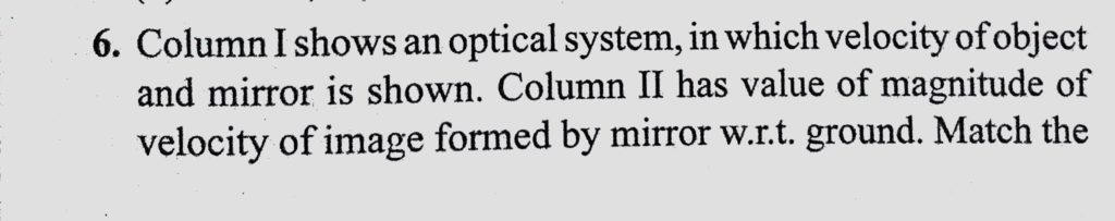 Column 1 shows an optical system, in which velocity of object and mirror is shown. Column 2 has value of magnitude of velocity of image formed by mirror w.r.t. ground. Match the proper entries from column 2 to column 1. Column 1 shows an optical system in which velocity of object and mirror is shown. Column 2 has value of magnitude of velocity of image formed by mirror w.r.t. ground. Match the proper entries from column 2 to column 1. October 7, 2020 Category: Uncategorised (JEE Advanced Physics by BM Sharma + GMP Solutions) , Facebook Messenger WhatsApp Share this:TwitterFacebook Related