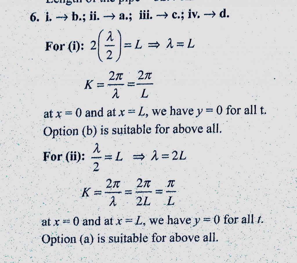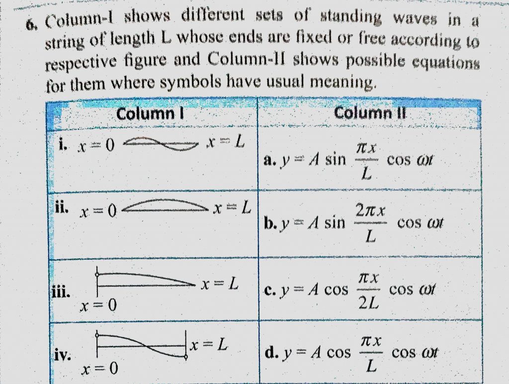 Column 1 shows different sets of standing waves in a string of length L whose ends are fixed or free according to respective figure and Column 2 shows possible equations for them Column 1 shows different sets of standing waves in a string of length L whose ends are fixed or free according to respective figure and Column 2 shows possible equations for them November 6, 2020 Category: Uncategorised (JEE Advanced Physics by BM Sharma + GMP Solutions) , Facebook Messenger WhatsApp Share this:TwitterFacebook Related