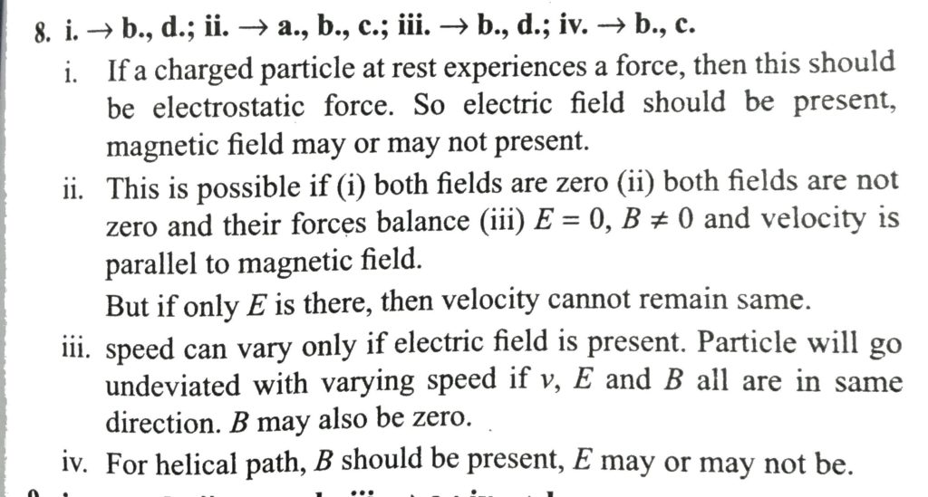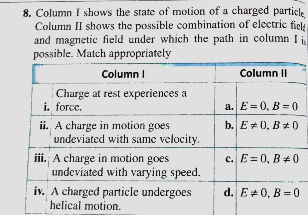Column I shows the state of motion of a charge particle. ColumnII shows the possible combintaion of electric field and magnetic field under which the path in column I is possible . Match appropriately. A charged particle passes through a region that could have electric field only or magnetic field only or both electric and magnetic fields or none of the fields. Match Column I with Column II October 16, 2020 Category: Uncategorised (JEE Advanced Physics by BM Sharma + GMP Solutions) , Facebook Messenger WhatsApp Share this:TwitterFacebook Related