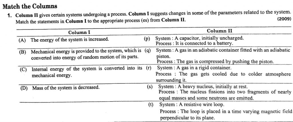 Column II gives certain systems undergoing a process. Column I suggests changes in some of the parameters related to the system. Match the statements in Column I to the appropriate process(es) from Column II The energy of a system as a function of time t is given as E(t)=A^2 exp(−αt) the percentage error in the value of E(t) at t = 5 s` is The pitch of a screw gauge is 1 mm and there are 100 divisions on the circular scale. While measuring the diameter of a wire α=0.2 s−1. The measurement of A has an error of 1.25%. If the error In the measurement of time is 1.50% February 12, 2021 Category: Uncategorised (JEE Advanced Physics by BM Sharma + GMP Solutions) , Facebook Messenger WhatsApp Share this:TwitterFacebook Related