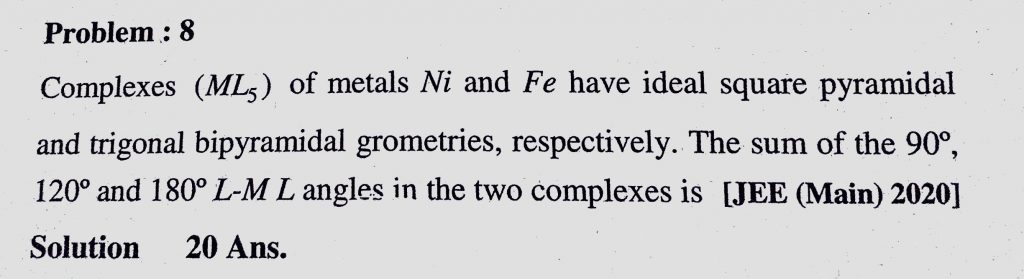 Complexes (ML5) of metals Ni and Fe have ideal square pyramidal and trigonal bipyramidal grometries, respectively. The sum of the 90, 120 and 180 L-M L angles in the two complexes is 120 and 180 L-M L angles in the two complexes is Complexes (ML5) of metals Ni and Fe have ideal square pyramidal and trigonal bipyramidal grometries respectively. The sum of the 90 December 6, 2020 Category: Uncategorised (JEE Advanced Physics by BM Sharma + GMP Solutions) , Facebook Messenger WhatsApp Share this:TwitterFacebook Related