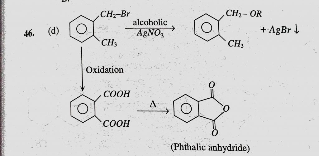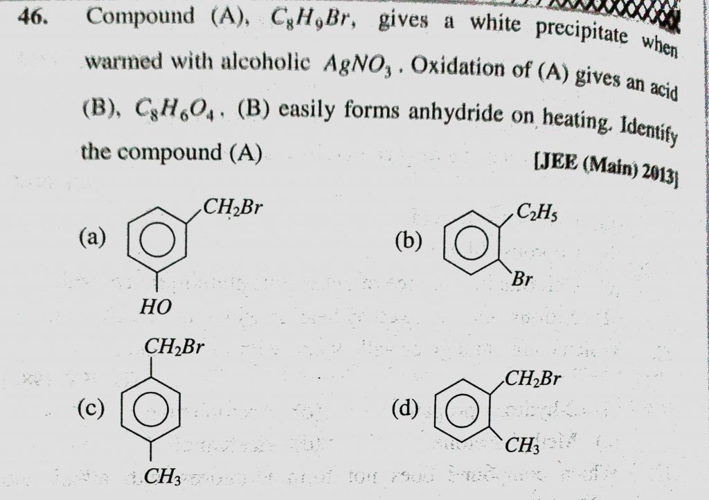 Compound (A), C8H9Br, gives a white precipitate when warmed with alcoholic AgNO3, Oxidation of (A) gives an acid (B) C8H6O4. (B) easily forms anhydride on heating. Identify the compound (A) C8H9Br Compound (A) gives a white precipitate when warmed with alcoholic AgNO3 Oxidation of (A) gives an acid (B) C8H6O4. (B) easily forms anhydride on heating. Identify the compound (A) February 9, 2021 Category: Uncategorised (JEE Advanced Physics by BM Sharma + GMP Solutions) , Facebook Messenger WhatsApp Share this:TwitterFacebook Related