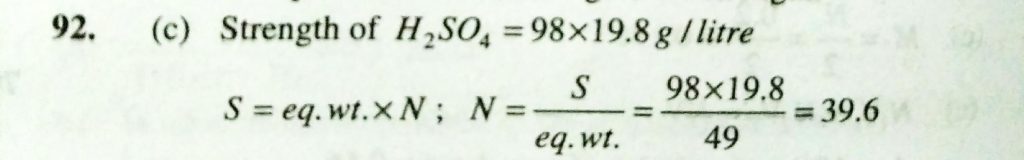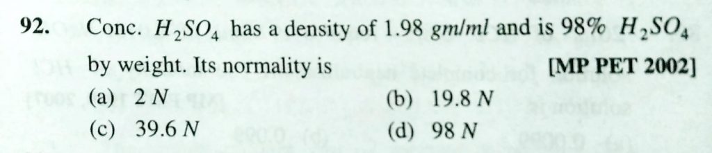Conc. H2SO4 has a density of 1.98 gm/ml and is 98% H2SO4 by weight. Its normality is (a) 2 N (b) 19.8 N (c) 39.6 N (d) 98 N Conc. H2SO4 has a density of 1.98 gm/ml and is 98% H2SO4 by weight. Its normality is (a) 2 N (b) 19.8 N (c) 39.6 N (d) 98 N December 12, 2020 Category: Uncategorised (JEE Advanced Physics by BM Sharma + GMP Solutions) , Facebook Messenger WhatsApp Share this:TwitterFacebook Related