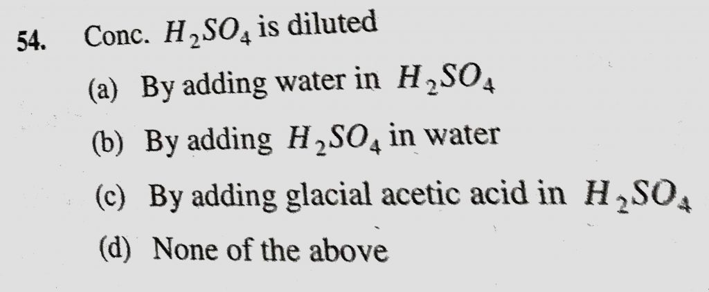 Conc. H2SO4 is diluted (a) By adding water in H2SO4 (b) By adding H2SO4 in water Conc. H2SO4 is diluted (a) By adding water in H2SO4 (b) By adding H2SO4 in water November 23, 2020 Category: Uncategorised (JEE Advanced Physics by BM Sharma + GMP Solutions) , Facebook Messenger WhatsApp Share this:TwitterFacebook Related