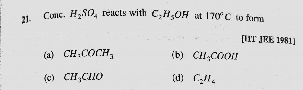 Conc. H2SO4 reacts with C2H5OH at 170 C to form (a) CH3COCH3 (b) CH3COOH (c) CH3CHO (d) C2H4 Conc. H2SO4 reacts with C2H5OH at 170 C to form (a) CH3COCH3 (b) CH3COOH (c) CH3CHO (d) C2H4 February 11, 2021 Category: Uncategorised (JEE Advanced Physics by BM Sharma + GMP Solutions) , Facebook Messenger WhatsApp Share this:TwitterFacebook Related