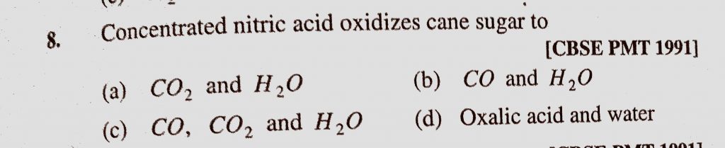 Concentrated nitric acid oxidizes cane sugar to (a) CO2 and H2O (b) CO and H2O (c) CO, CO2 and H2O (d) Oxalic acid and water CO2 and H2O (d) Oxalic acid and water Concentrated nitric acid oxidizes cane sugar to (a) CO2 and H2O (b) CO and H2O (c) CO November 18, 2020 Category: Uncategorised (JEE Advanced Physics by BM Sharma + GMP Solutions) , Facebook Messenger WhatsApp Share this:TwitterFacebook Related