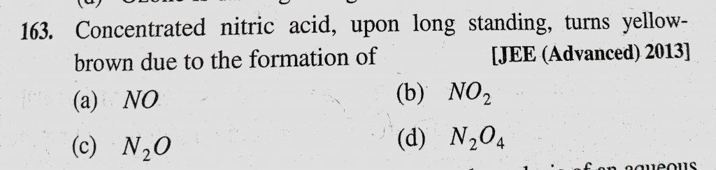 Concentrated nitric acid, upon long standing, turns yellow-brown due to the formation of (a) NO (b) NO2 (c) N2O (d) N2O4 Concentrated nitric acid turns yellow-brown due to the formation of (a) NO (b) NO2 (c) N2O (d) N2O4 upon long standing November 28, 2020 Category: Uncategorised (JEE Advanced Physics by BM Sharma + GMP Solutions) , Facebook Messenger WhatsApp Share this:TwitterFacebook Related