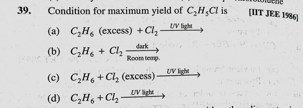 Condition for maximum yield of C2H5Cl is (a) C2H6(excess) + Cl2 (b) C2H6 + Cl2 (c) C2H6 + Cl2(excess) (d) C2H6 + Cl2 Condition for maximum yield of C2H5Cl is (a) C2H6(excess) + Cl2 (b) C2H6 + Cl2 (c) C2H6 + Cl2(excess) (d) C2H6 + Cl2 December 16, 2020 Category: Uncategorised (JEE Advanced Physics by BM Sharma + GMP Solutions) , Facebook Messenger WhatsApp Share this:TwitterFacebook Related