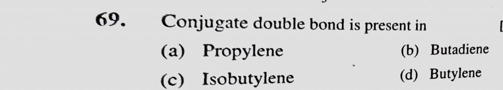 Conjugate double bond is present in (a) Propylene (b) Butadiene (c) Isobutylene (d) Butylene Conjugate double bond is present in (a) Propylene (b) Butadiene (c) Isobutylene (d) Butylene December 13, 2020 Category: Uncategorised (JEE Advanced Physics by BM Sharma + GMP Solutions) , Facebook Messenger WhatsApp Share this:TwitterFacebook Related