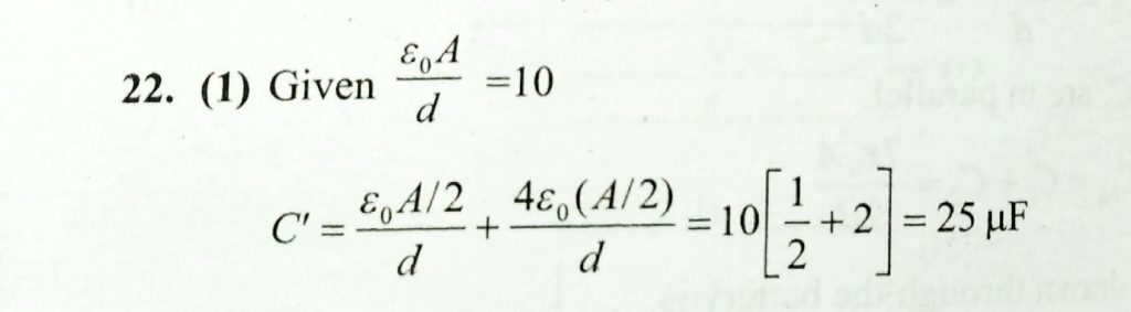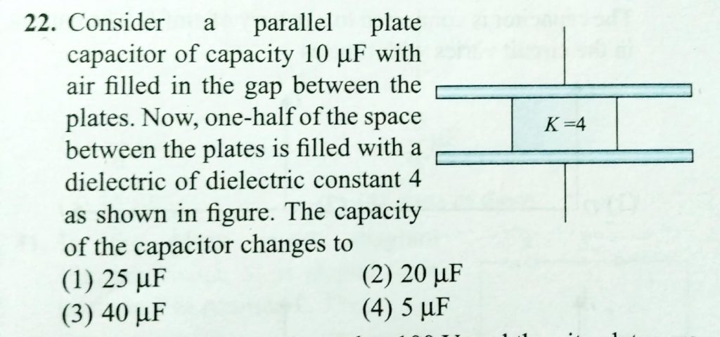 Consider a disconnected. Plate capacitor of capacity 10μ with air filled in the gap between the plates. Now one-half of the space between the plates is filled with a dielectric of dielectric constant 4 as shown in .The capacity of the capacitor changes to