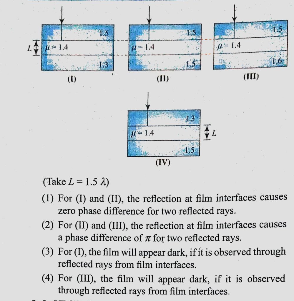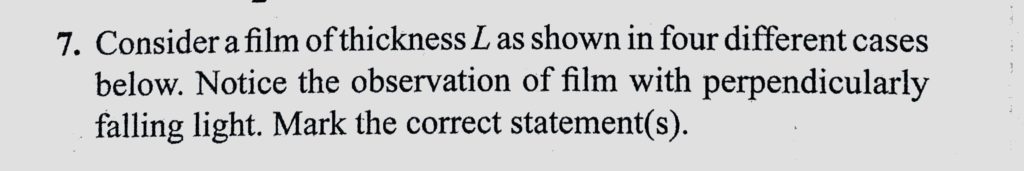 Consider a film of thickness L as shown in four different cases below. Notice the observation of film with perpendicularly falling light. Mark the correct statement(s). Consider a film of thickness L as shown in four different cases below. Notice the observation of film with perpendicularly falling light. Mark the correct statement(s). October 11, 2020 Category: Uncategorised (JEE Advanced Physics by BM Sharma + GMP Solutions) , Facebook Messenger WhatsApp Share this:TwitterFacebook Related