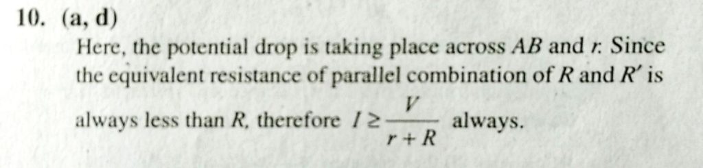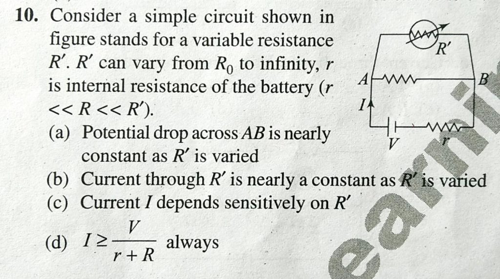 Consider a simple circuit shown in figure stands for a variable resistance R’. R’ can vary from R0 to infinity, r is internal resistance of the battery (r <<R<<R’). (a) Potential drop across AB is nearly constant as R’ is varied. Consider a simple circuit shown in figure stands for a variable resistance R’. R’ can vary from R0 to infinity r is internal resistance of the battery (r <<R<<R’). (a) Potential drop across AB is nearly constant as R’ is varied. September 19, 2020 Category: Uncategorised (JEE Advanced Physics by BM Sharma + GMP Solutions) , Facebook Messenger WhatsApp Share this:TwitterFacebook Related