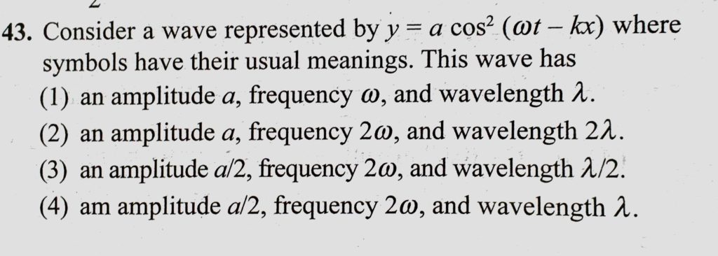 Consider a wave represented by y = a cos^2 (omega t – kx) where symbols have their usual meanings. This wave has Consider a wave represented by y = a cos^2 (omega t - kx) where symbols have their usual meanings. This wave has November 1, 2020 Category: Uncategorised (JEE Advanced Physics by BM Sharma + GMP Solutions) , Facebook Messenger WhatsApp Share this:TwitterFacebook Related