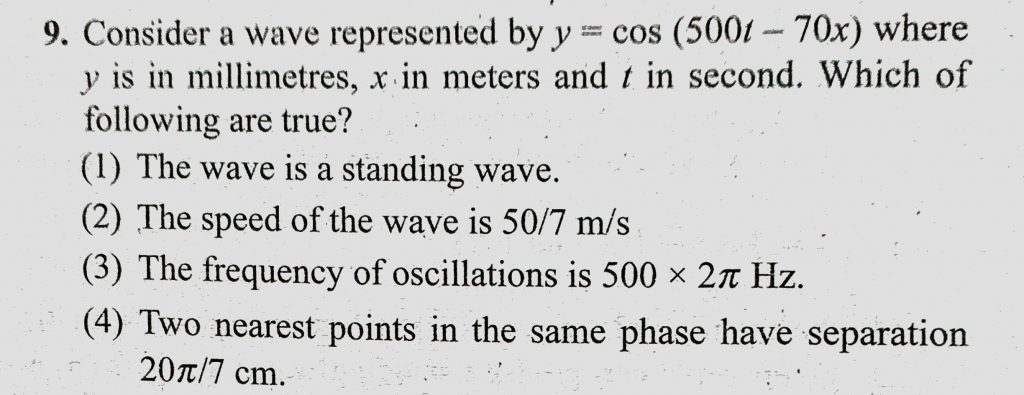 Consider a wave represented by y = cos (500t – 70x) where y is in millimetres, x in meters and t in seconds. Which of following are true ? Consider a wave represented by y = cos (500t - 70x) where y is in millimetres x in meters and t in seconds. Which of following are true ? November 5, 2020 Category: Uncategorised (JEE Advanced Physics by BM Sharma + GMP Solutions) , Facebook Messenger WhatsApp Share this:TwitterFacebook Related