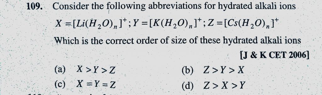 Consider the following abbreviations for hydrated alkali ions Which is the correct order of size of these hydrated alkali ions (a) X > Y > Z Consider the following abbreviations for hydrated alkali ions Which is the correct order of size of these hydrated alkali ions (a) X > Y > Z November 15, 2020 Category: Uncategorised (JEE Advanced Physics by BM Sharma + GMP Solutions) , Facebook Messenger WhatsApp Share this:TwitterFacebook Related