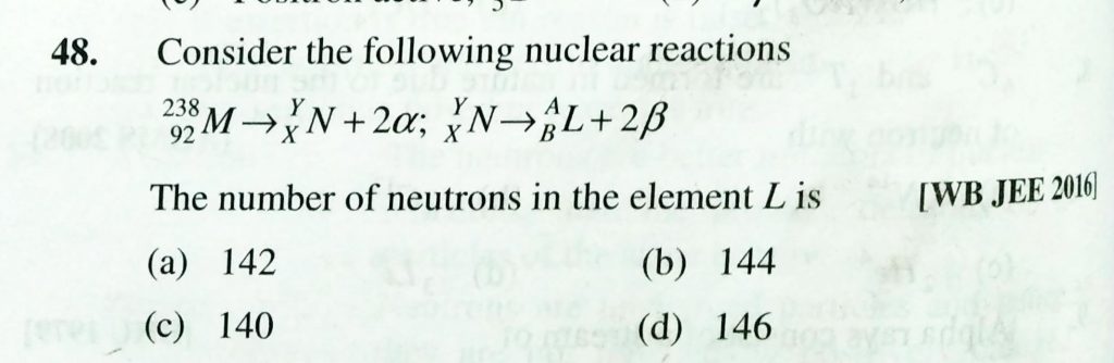 Consider the following nuclear reactions 238 92 M to x y N + 2 alpha ; y x N to A B L + 2 bita The number of neutrons in the element L is Consider the following nuclear reactions 238 92 M to x y N + 2 alpha ; y x N to A B L + 2 bita The number of neutrons in the element L is February 14, 2021 Category: Uncategorised (JEE Advanced Physics by BM Sharma + GMP Solutions) , Facebook Messenger WhatsApp Share this:TwitterFacebook Related