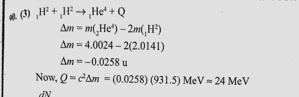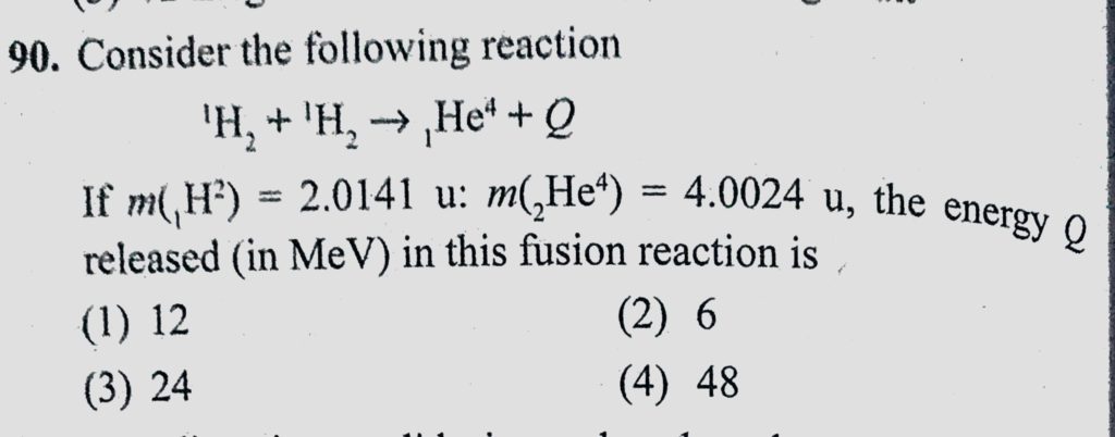Consider the following reaction 1H2 + 1H2 gives 1He4 + Q If m(1H2) = 2.0141 u: m(2He4) = 4.0024 u, the energy Q released (in MeV) in this fusion reaction is Consider the following reaction 1H2 + 1H2 gives 1He4 + Q If m(1H2) = 2.0141 u: m(2He4) = 4.0024 u the energy Q released (in MeV) in this fusion reaction is October 18, 2020 Category: Uncategorised (JEE Advanced Physics by BM Sharma + GMP Solutions) , Facebook Messenger WhatsApp Share this:TwitterFacebook Related