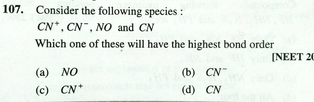 Consider the following species : CN^+ , Cn^- NO and CN which one of these will have the highest bond order Cn^- NO and CN which one of these will have the highest bond order Consider the following species : CN^+ December 9, 2020 Category: Uncategorised (JEE Advanced Physics by BM Sharma + GMP Solutions) , Facebook Messenger WhatsApp Share this:TwitterFacebook Related