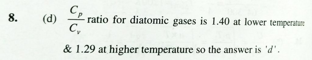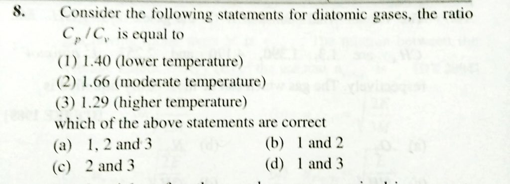Consider the following statements for diatomic gases, the ratio Cp/Cv is equal to (1) 1.40 (lower temperature ) (2) 1.66 (moderate temperature ) (3) 1.29 (higher temperature ) which of the above statements are correct Consider the following statements for diatomic gases the ratio Cp/Cv is equal to (1) 1.40 (lower temperature ) (2) 1.66 (moderate temperature ) (3) 1.29 (higher temperature ) which of the above statements are correct February 12, 2021 Category: Uncategorised (JEE Advanced Physics by BM Sharma + GMP Solutions) , Facebook Messenger WhatsApp Share this:TwitterFacebook Related
