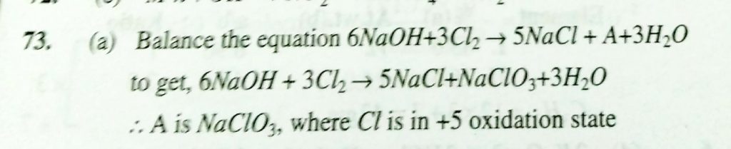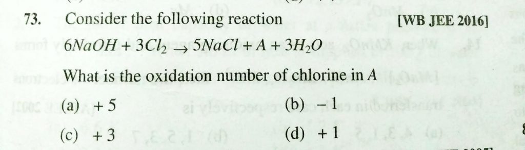 Consider the following treaction 6NaOH +3Cl2 gives 5NaCL +A +3H2O what is the oxidation number of chlorine in A Consider the following treaction 6NaOH +3Cl2 gives 5NaCL +A +3H2O what is the oxidation number of chlorine in A November 24, 2020 Category: Uncategorised (JEE Advanced Physics by BM Sharma + GMP Solutions) , Facebook Messenger WhatsApp Share this:TwitterFacebook Related
