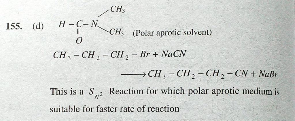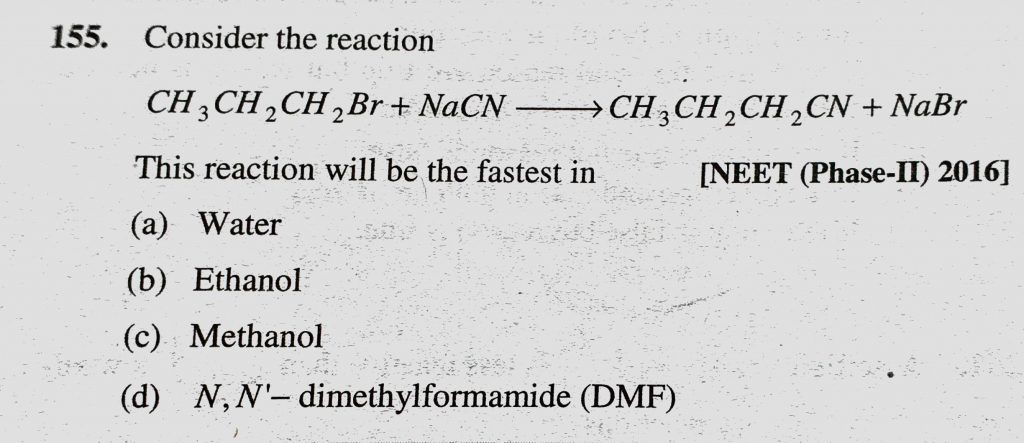 Consider the reaction CH3CH2CH2Br + NaCN to CH3CH2CH2CN + NaBr This reaction will be the fastest in (a) Water (b) Ethanol (c) Methanol (d) N, N’-dimethylformamide (DMF) Consider the reaction CH3CH2CH2Br + NaCN to CH3CH2CH2CN + NaBr This reaction will be the fastest in (a) Water (b) Ethanol (c) Methanol (d) N N'-dimethylformamide (DMF) February 9, 2021 Category: Uncategorised (JEE Advanced Physics by BM Sharma + GMP Solutions) , Facebook Messenger WhatsApp Share this:TwitterFacebook Related