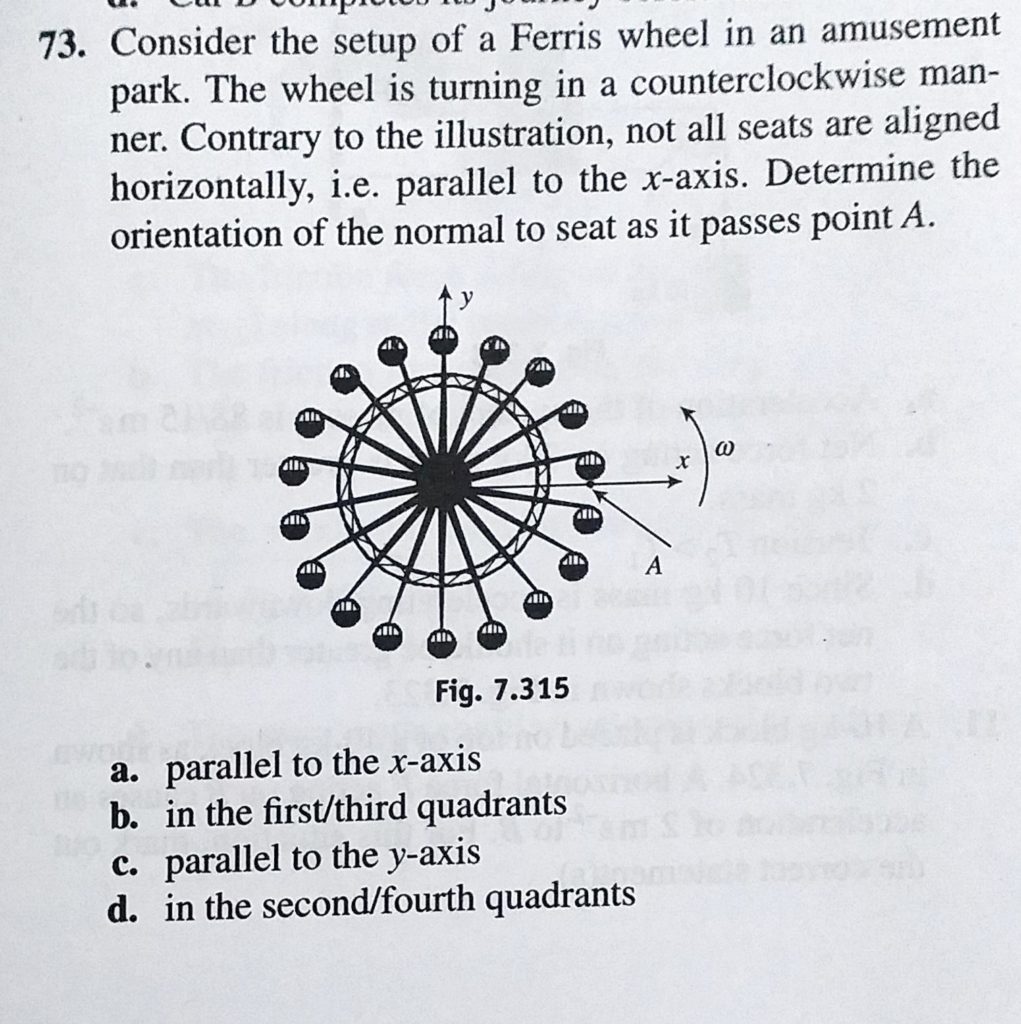 Consider the setup of a Ferris wheel in an amusement park. The wheel is turning in a counterclockwise manner. Contrary to the illustration, not all seats are aligned horizontally, i.e. parallel to the x axis. Consider the setup of a Ferris wheel in an amusement park. The wheel is turning in a counterclockwise manner. Contrary to the illustration i.e. parallel to the x axis. not all seats are aligned horizontally October 1, 2020 Category: Uncategorised (JEE Advanced Physics by BM Sharma + GMP Solutions) , Facebook Messenger WhatsApp Share this:TwitterFacebook Related