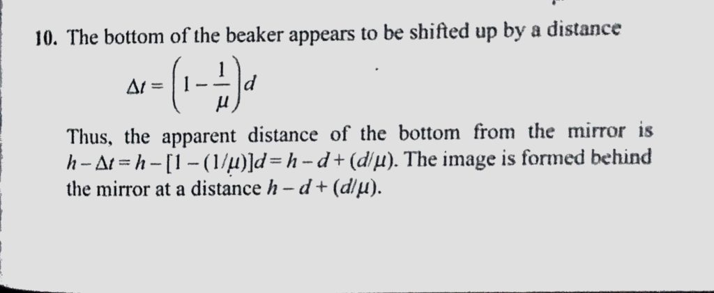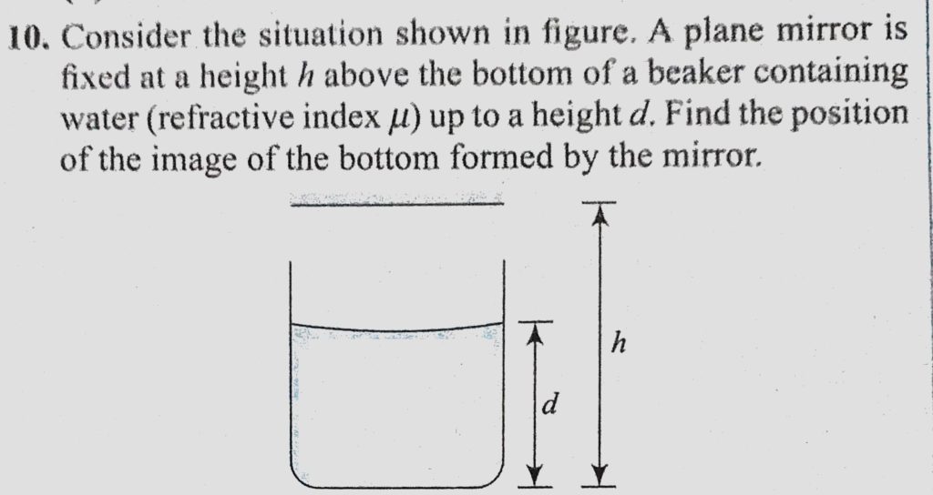Consider the situation shown in figure. A plane mirror is fixed at a height h above the bottom of a beaker containing water (re fraction index mu) up to a height d. Find the position of the image of the bottom A slab of water is on the top of a glass slab of refractive index 2. At what angle to the normal must a ray be incident on the top surface of the glass slab so that it is reflected from the bottom October 5, 2020 Category: Uncategorised (JEE Advanced Physics by BM Sharma + GMP Solutions) , Facebook Messenger WhatsApp Share this:TwitterFacebook Related