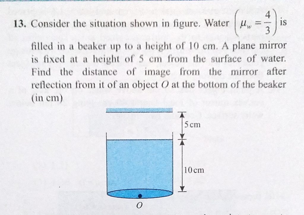 Consider the situation shown in figure. Water ( mu w = 4/3) is filled in a beaker up to a height of 10 cm. A plane mirror is fixed at a height of 5 cm from the surface of water. Find the distance Consider the situation shown in figure. Water ( mu w = 4/3) is filled in a beaker up to a height of 10 cm. A plane mirror is fixed at a height of 5 cm from the surface of water. Find the distance October 7, 2020 Category: Uncategorised (JEE Advanced Physics by BM Sharma + GMP Solutions) , Facebook Messenger WhatsApp Share this:TwitterFacebook Related