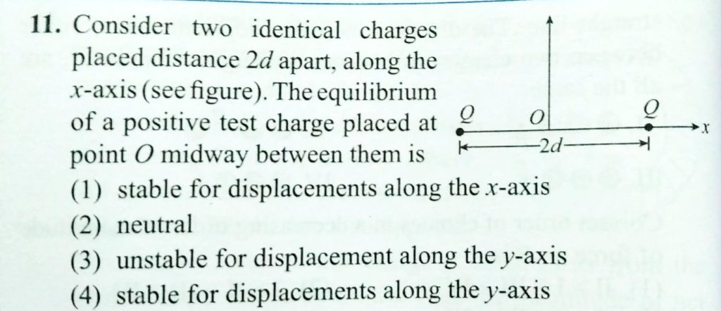 Consider two identical charges placed distance 2 d apart , along the x- axis . The equilibrium of a positive test charge placed at point O midway between them is along the x- axis . The equilibrium of a positive test charge placed at point O midway between them is Consider two identical charges placed distance 2 d apart October 30, 2020 Category: Uncategorised (JEE Advanced Physics by BM Sharma + GMP Solutions) , Facebook Messenger WhatsApp Share this:TwitterFacebook Related