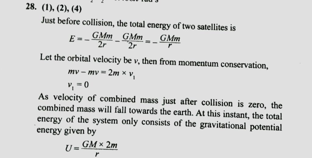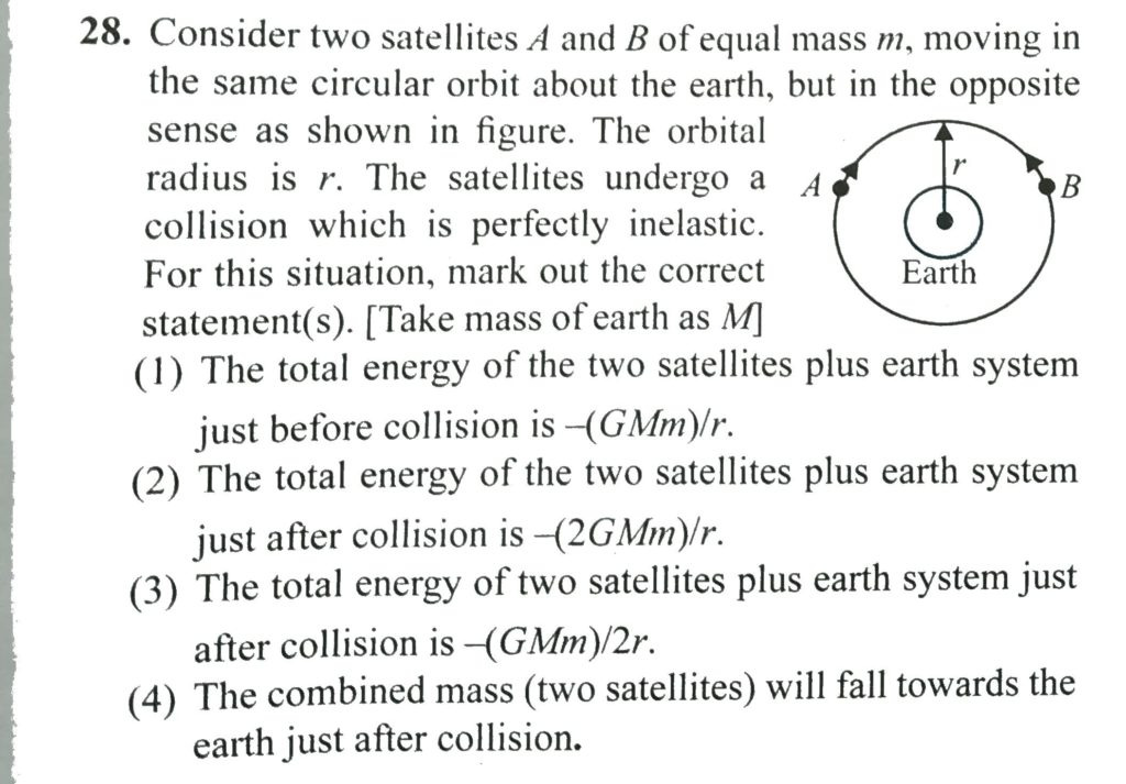 Consider two satellites A and B of equal mass m, moving in the same circular orbit about the earth, but in the opposite sense as shown in figure. The orbital radius is r. The satellites undergo a collision which is perfectly inelastic. For this situation, mark out the correct statement(s). (Take mass of earth as M)