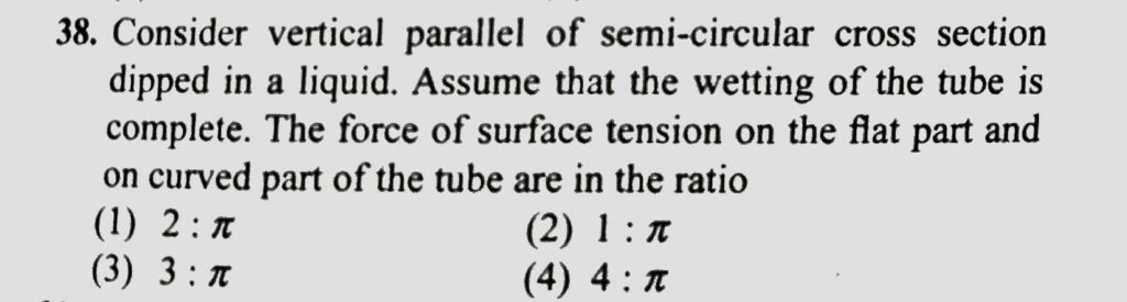 Consider vertical parallel of semi-circular cross section dipped in a liquid. Assume that the wetting of the tube is complete. The force of surface tension on the flat part and on curved part of the tube are in the ratio Water rises to a height h in a capilliary tube of cross sectional area A. The height to which water will rise in a capilliary tube of cross sectional area 4 A will be October 11, 2020 Category: Uncategorised (JEE Advanced Physics by BM Sharma + GMP Solutions) , Facebook Messenger WhatsApp Share this:TwitterFacebook Related