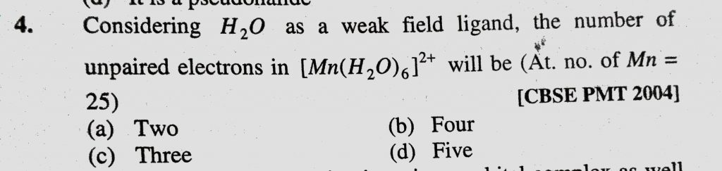 Considering H2O as a weak field ligand, the number of unpaired electrons in (Mn(H2o)6)2+ will be (At. no. of Mn = 25) Considering H2O as a weak field ligand the number of unpaired electrons in (Mn(H2o)6)2+ will be (At. no. of Mn = 25) December 4, 2020 Category: Uncategorised (JEE Advanced Physics by BM Sharma + GMP Solutions) , Facebook Messenger WhatsApp Share this:TwitterFacebook Related