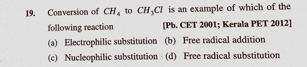 Conversion of CH4 to CH3Cl is an example of which of the following reaction (a) Electrophilic substitution (b) Free radical addition Conversion of CH4 to CH3Cl is an example of which of the following reaction (a) Electrophilic substitution (b) Free radical addition December 9, 2020 Category: Uncategorised (JEE Advanced Physics by BM Sharma + GMP Solutions) , Facebook Messenger WhatsApp Share this:TwitterFacebook Related