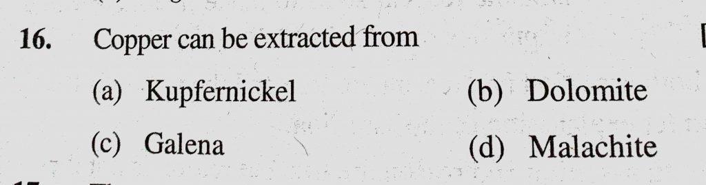 Copper can be extracted from (a) Kupfernickel (b) Dolomite (c) Galena (d) Malachite Copper can be extracted from (a) Kupfernickel (b) Dolomite (c) Galena (d) Malachite November 12, 2020 Category: Uncategorised (JEE Advanced Physics by BM Sharma + GMP Solutions) , Facebook Messenger WhatsApp Share this:TwitterFacebook Related