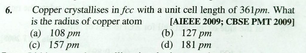 Copper crystallises in fcc with a unit cell length of 361 pm. what is the radius of copper atom (a) 108 pm (b) 127 pm (c) 157 pm (d) 181 pm Copper crystallises in fcc with a unit cell length of 361 pm. what is the radius of copper atom (a) 108 pm (b) 127 pm (c) 157 pm (d) 181 pm February 8, 2021 Category: Uncategorised (JEE Advanced Physics by BM Sharma + GMP Solutions) , Facebook Messenger WhatsApp Share this:TwitterFacebook Related