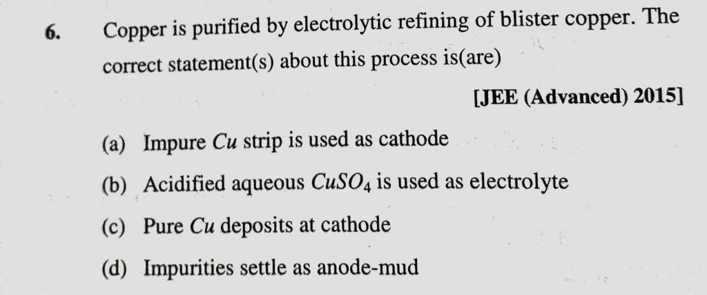 Copper is purified by electrolytic refining of blister copper. The correct statement(s) about this process is (are) (a) Impure Cu strip is used as cathode Copper is purified by electrolytic refining of blister copper. The correct statement(s) about this process is (are) (a) Impure Cu strip is used as cathode November 12, 2020 Category: Uncategorised (JEE Advanced Physics by BM Sharma + GMP Solutions) , Facebook Messenger WhatsApp Share this:TwitterFacebook Related