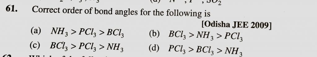 Correct order of bond angles for the following is (a) NH3 > PCL3 >BCL3 (b) BCL3> NH3 > PCL3 (c) BCL3 > PCL3 > NH3 (d) PCL3 > BCL3 > NH3 Correct order of bond angles for the following is (a) NH3 > PCL3 >BCL3 (b) BCL3> NH3 > PCL3 (c) BCL3 > PCL3 > NH3 (d) PCL3 > BCL3 > NH3 December 7, 2020 Category: Uncategorised (JEE Advanced Physics by BM Sharma + GMP Solutions) , Facebook Messenger WhatsApp Share this:TwitterFacebook Related
