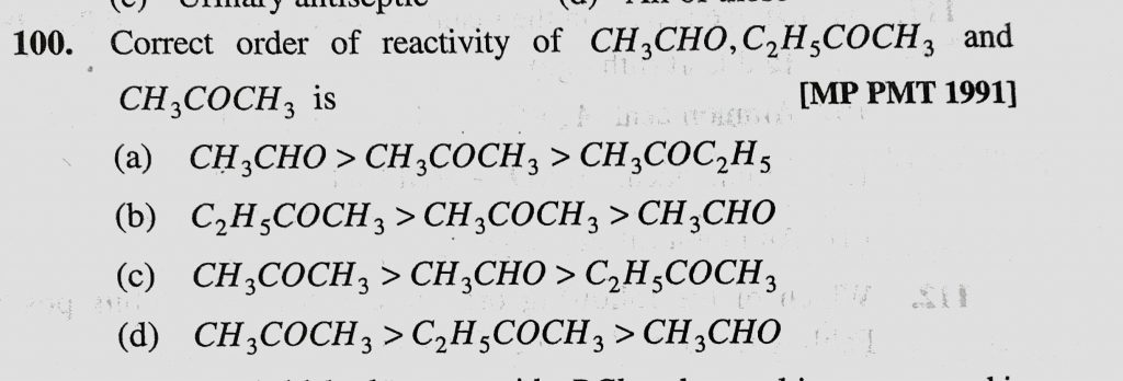 Correct order of reactivity of CH3CHO, C2H5COCH3 and CH3COCH3 is (a) CH3CHO > CH3COCH3 > CH3COC2H5 (b C2H5COCH3 and CH3COCH3 is (a) CH3CHO > CH3COCH3 > CH3COC2H5 (b Correct order of reactivity of CH3CHO February 12, 2021 Category: Uncategorised (JEE Advanced Physics by BM Sharma + GMP Solutions) , Facebook Messenger WhatsApp Share this:TwitterFacebook Related