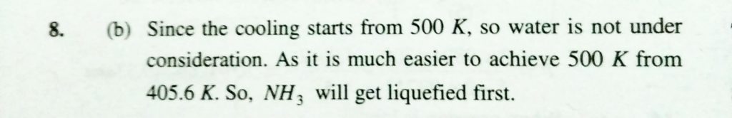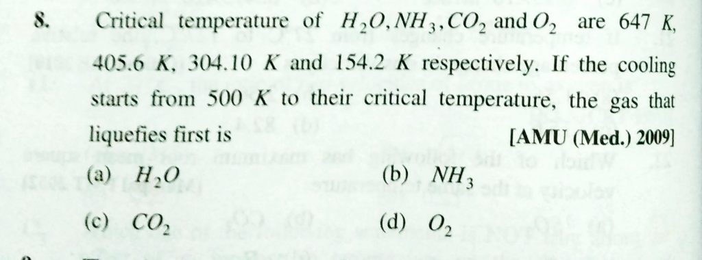 Critical temperature of H2O, NH3 , CO2 and O2 are 647 K, 405.6 K , 304.10 K and 154.2 K respectively . If the cooling starts from 500 K to their critical temperature, the gas that liquifies first is 304.10 K and 154.2 K respectively . If the cooling starts from 500 K to their critical temperature 405.6 K CO2 and O2 are 647 K Critical temperature of H2O NH3 the gas that liquifies first is February 12, 2021 Category: Uncategorised (JEE Advanced Physics by BM Sharma + GMP Solutions) , Facebook Messenger WhatsApp Share this:TwitterFacebook Related